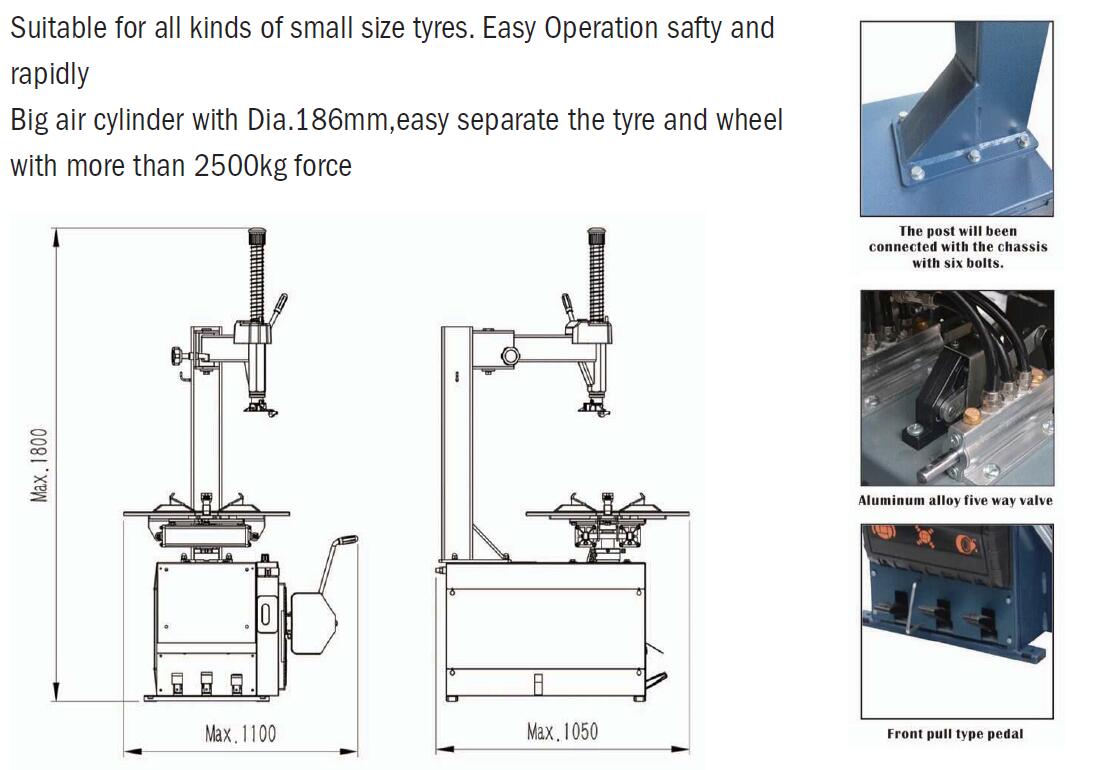 Suitable for all kinds of small size tyres. Easy Operation safty and rapidly Big air cylinder with Dia.186mm,easy separate the tyre and wheel with more than 2500kg force